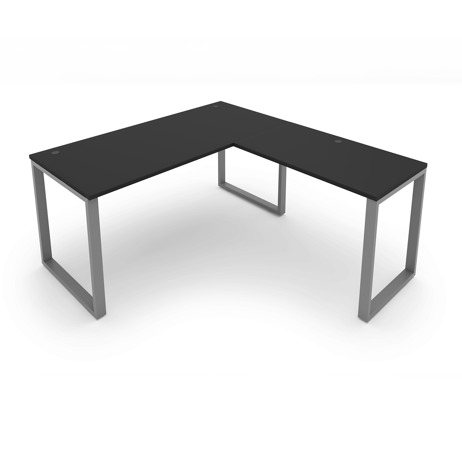 Fusion Metal Leg L-Shaped Desk with Fluted Edge Top and Grommets – Matte Black Top, Silver Base