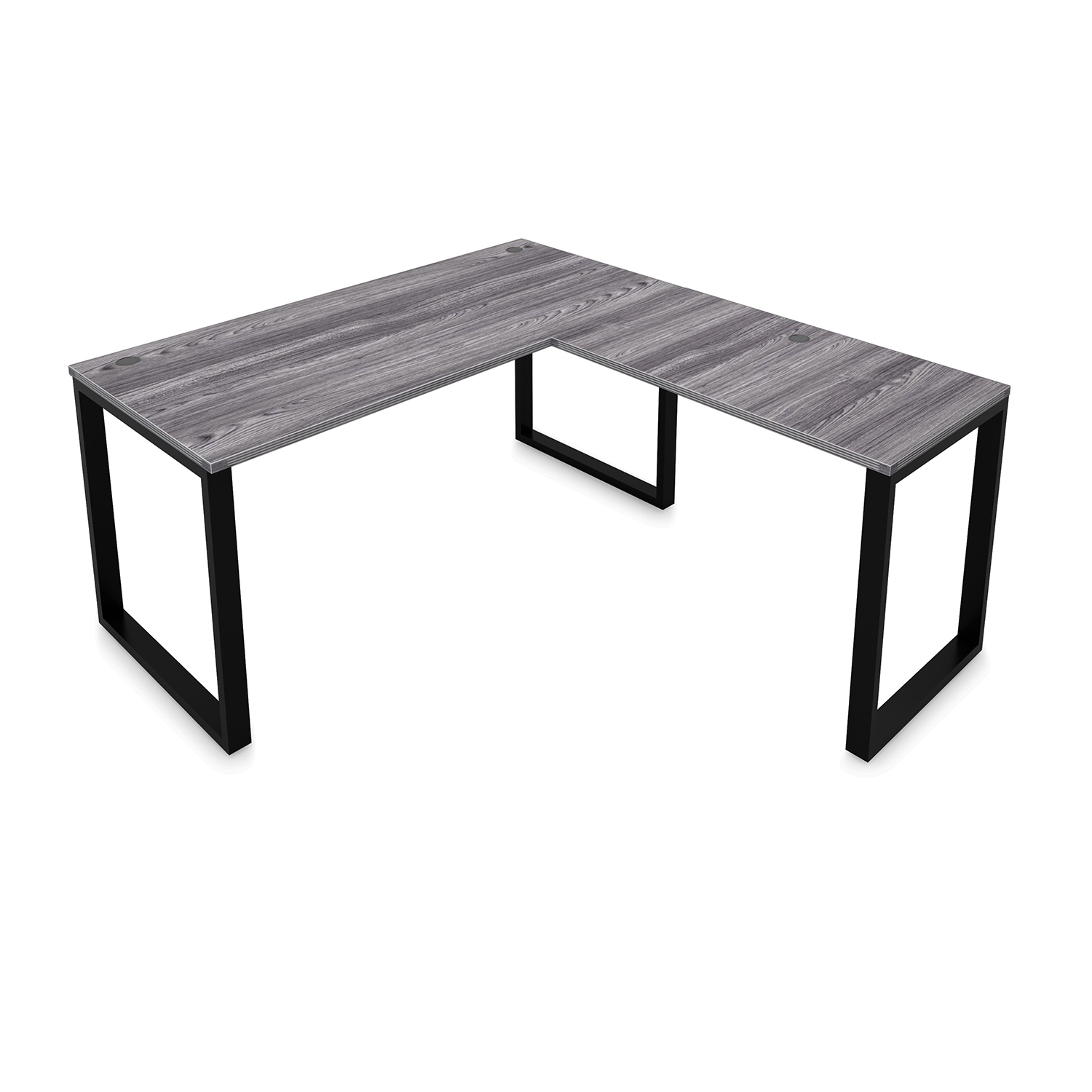 Fusion Metal Leg L-Shaped Desk with Fluted Edge Top and Grommets – Samoa Gray Top, Black Base